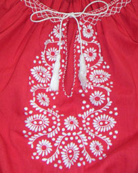 色:生地・白、刺繍・赤黒黄 形状:長袖 材質:綿100% 通気性の良いガーゼ状生地 サイズ:M(女性用) 着丈60cm、胸囲108cm、 袖下42cm、袖幅21.5cm、 袖口廻り17cm(ボタンを留めた状態)、 襟ぐり約36cm(紐で調節可)、前立て14cm 拡大図:全体 襟元 肩 |