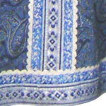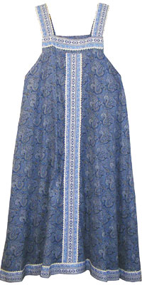 色:青・ペイズリー柄 形状:ロングジャンパースカート 材質:綿・化繊混紡? 薄手 サイズ:L(女性用) 着丈122cm(肩紐17cm+スカート105cm)、 胸囲100cm、裾廻り240cm 拡大図:全体 裾 |