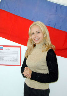 白・青・赤のロシア国旗の前で