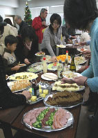 色とりどりのご馳走。洋風寿司のような蟹サラダやボルシチが好評でした。