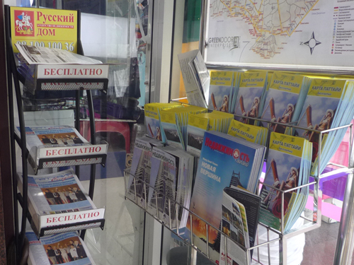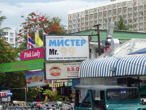 「今タイのパタヤにおり、街角でたくさんのロシア語に出会いました。ロシア人向けに、あちこちでコンドミニアムの売り込み広告や、ロシア語メニューを提供するレストランがたくさんあってびっくりしました。」 左の看板はインド料理レストランです。スパイシーなカレー色の看板に「ロシア語のメニュー辛くない」と張り紙が(Kさんのクラスのサーシャ先生によると「少し間違っているけど通じます」とのこと)。辛いものが苦手なロシア人向けにご案内というわけです。